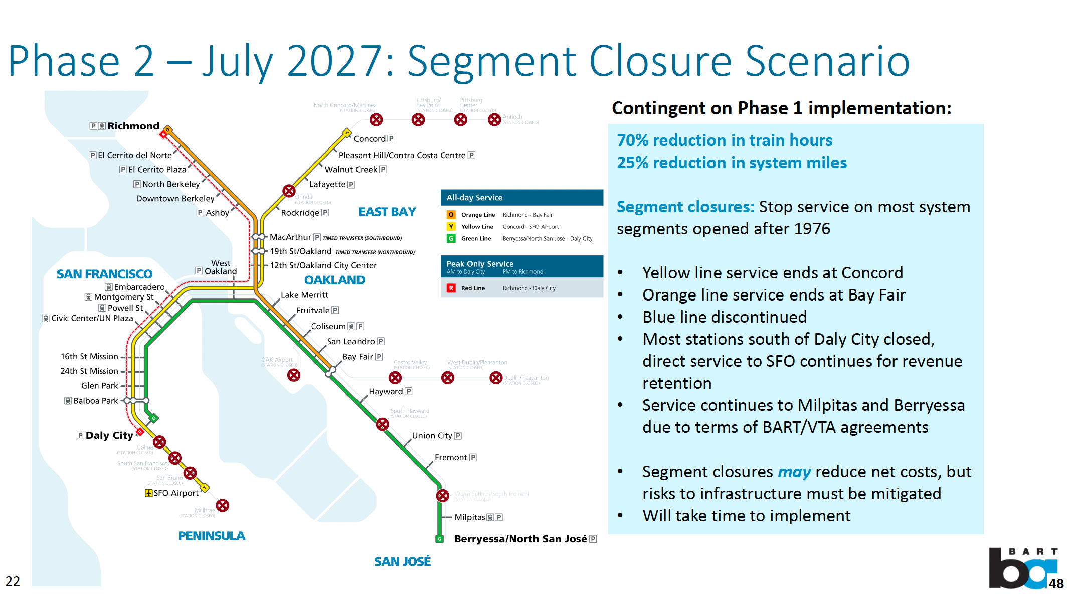 Without the extra revenue, Foley said,"Phase 2" beginning July 2027, would include increasing fares by 50 percent and closing up to 15 stations. The Yellow Line, the most used in the BART system, would end in Concord, cutting off service to Antioch, Pittsburg, Bay Point, and reducing service to lower-ridership stations in Orinda, Castro Valley, and Dublin. Concord would become the hub for commuters from Brentwood, Discovery Bay, and Oakley, who would have to find parking and then transfer to BART. "A new funding model is really what we need to look at," Foley said.
