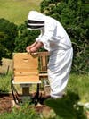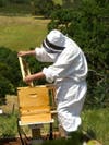 Gerken visits the hives frequently. It is a real advantage that he lives so close to the farm. He wears a white bee suit so that he can investigate their progress closely. He said he had seen one bee coming back to the hive literally covered in pollen. They like the purple wooly vetch growing on the hillside behind their hives. Their taste for different flowers is reflected in the various colors of the stored pollen.