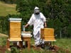 All went well with the emergence of the queen in each hive, and the life cycle of laying eggs and hatching young bees has begun in earnest. The workers build up the little walls of the honeycomb from a base of wax that Gerken applied. Then each space in the honeycomb becomes filled with pollen or eggs and young bees.