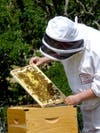 Since the bees already have filled the first box of each hive, a second box has been added. Gerken tells me that the eggs and young bees are within the center of the hive and the honey is being produced in the outer part of the comb – yum!