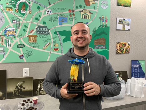 During a recent event at the Concord Visitor Center in Todos Santos Plaza, Visit Concord CEO & President Elaine Schroth selected Hernandez’s name in a random drawing among the finalists as the new 2021 Concord Taco Trail Champion.