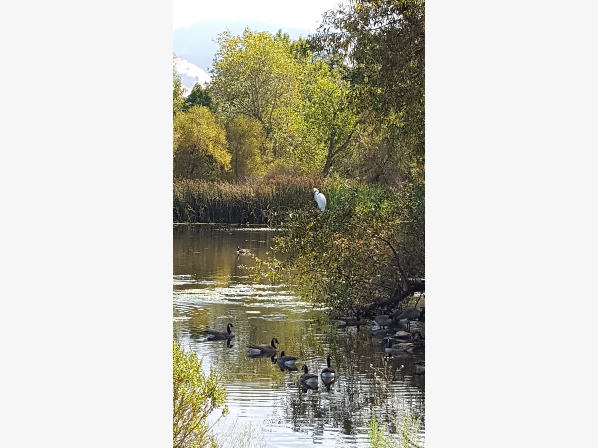A crane looks out over the water at Heather Farm Park, a 102-acre community park and nature preserve in Walnut Creek, Contra Costa County, California.