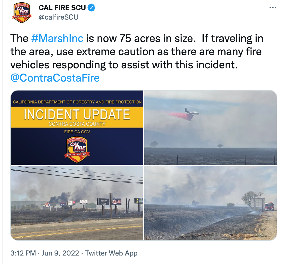 CONTRA COSTA COUNTY, CA — Crews from multiple agencies responded to a wildfire Thursday afternoon near Brentwood that ballooned to 200 acres by 5:15 p.m. The blaze is now 75 percent contained.