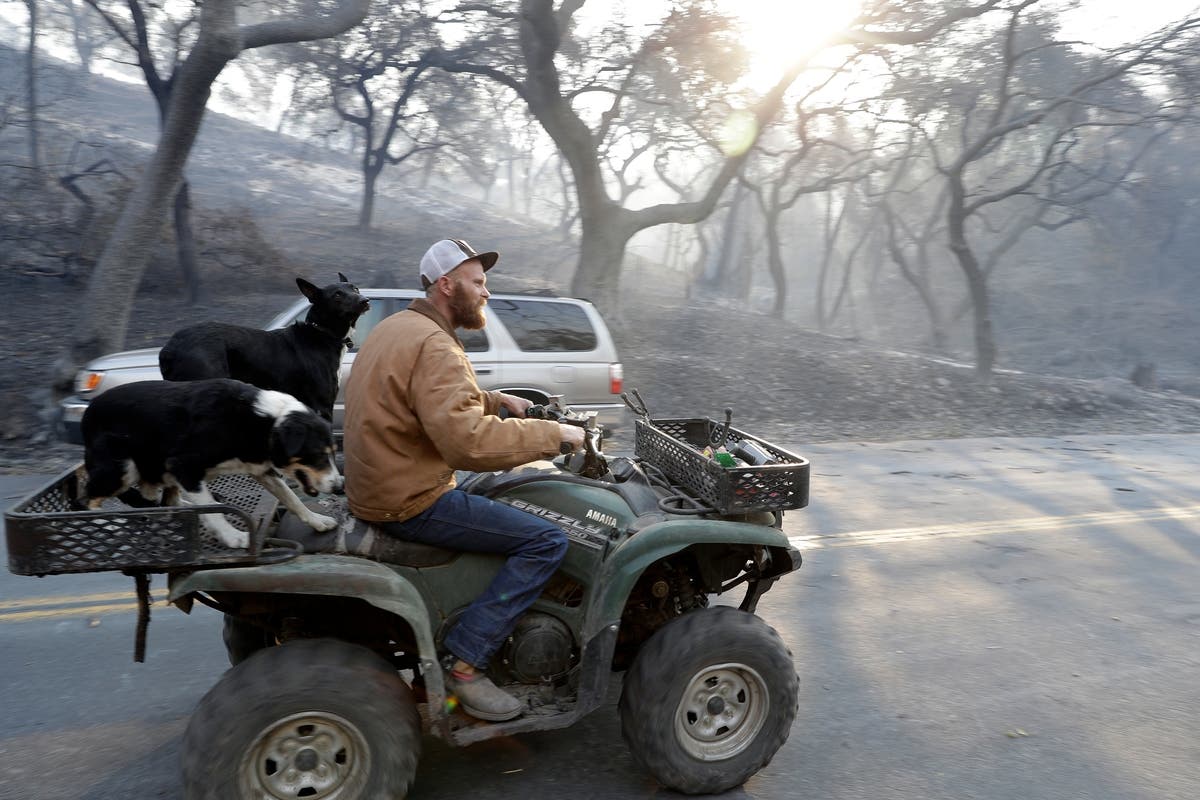 Photo: A man drives an all-terrain vehicle along a fire-ravaged Soda Canyon Road, in Napa, Calif. (Marcio Jose Sanchez/Associated Press)