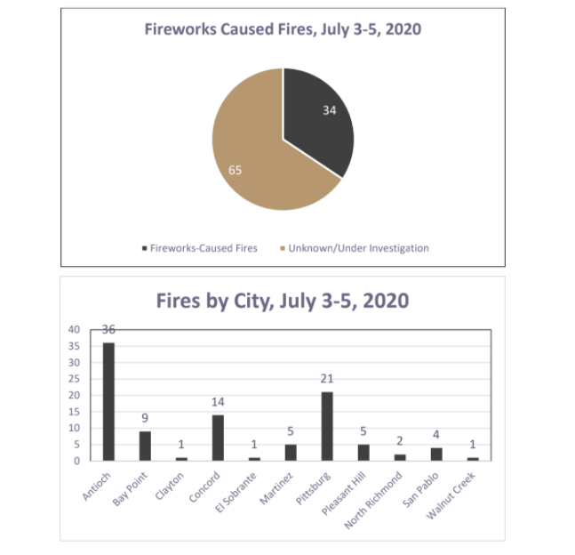 CONTRA COSTA COUNTY, CA — Firefighters with the Contra Costa County Fire Protection District responded to 93 fires, much of those related to fireworks, over the Fourth of July holiday, according to details made available Tuesday of the "unprecedented fire and EMS activity."