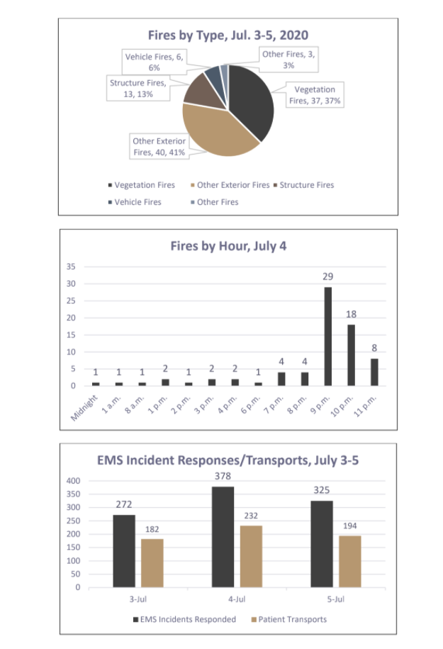 During the five-hour period from 7 p.m. to midnight on Saturday, July 4, the District dispatched firefighting resources to 63 grass, structure other fires, including those burning in backyards, in dumpsters and in vehicles. For the entire Independence Day weekend, responses numbered 93 for fires.