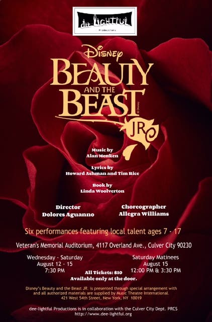 Culver City’s own dee-Lightful Productions, providing excellence in musical theatre education for kids since 1999, is proud to announce the upcoming performances of our 2015 Summer camp production, Disney’s “Beauty and the Beast Jr,” on August 12-15, 2015. Come see one of six performances of this family favorite featuring local talent ages 7-17.