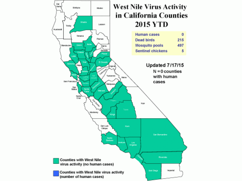 MAP as of July 17: Total Counties with WNV in 2015: 33. Alameda, Butte, Colusa, Contra Costa, El Dorado, Fresno, Glenn, Kern, Kings, Lake, Los Angeles, Madera, Marin, Merced, Orange, Placer, Riverside, Sacramento, San Bernardino, San Diego, San Joaquin, San Mateo, Santa Barbara, Santa Clara, Shasta, Solano, Sonoma, Stanislaus, Sutter, Tulare, Ventura, Yolo, and Yuba. Courtesy of CDPH.