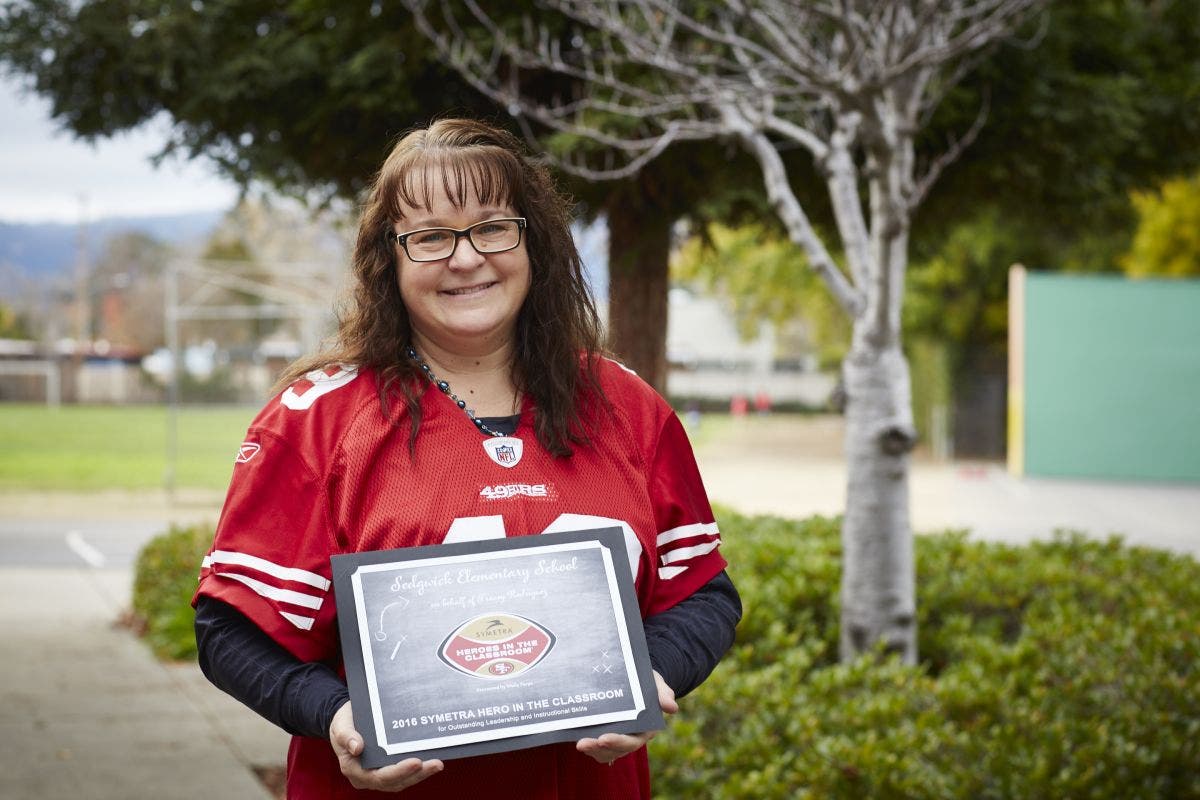 Symetra and the San Francisco 49ers honored Sedgwick Elementary School teacher Tracey Rodriguez as a “Symetra Hero in the Classroom” on Dec. 14 during a surprise classroom presentation. Rodriguez is a fifth grade instructor at the Cupertino school.