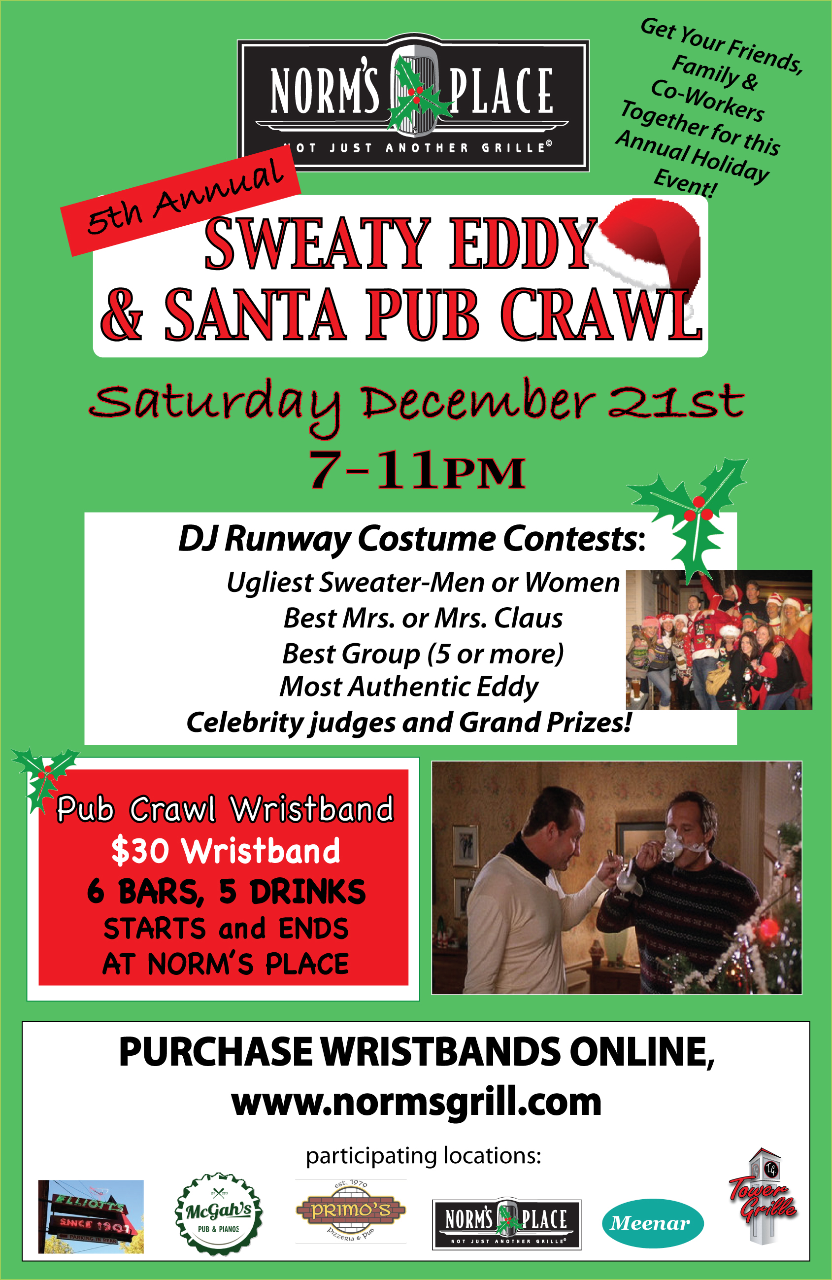 Details: Pub crawl will begin and end at Norm's Place. Pub Crawl locations: Norm’s Place, Elliott’s, McGah’s, Primo’s, Tower Grille and Meenar. Return back to Norm's Place by 10 p.m. for the last drink and Ugly Sweater Contests: