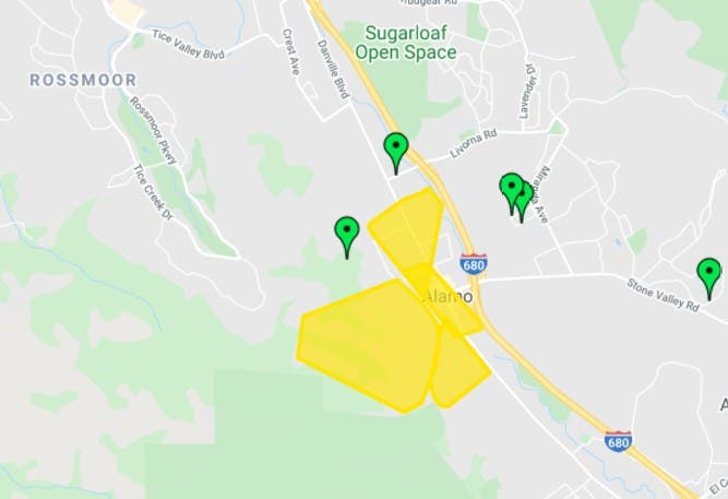 DANVILLE, CA — Pacific Gas & Electric reported on their outage map Sunday morning that more than 7,000 customers in Danville, Alamo and Blackhawk were without power.