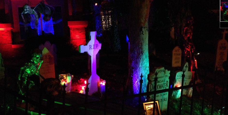“All my props including the gates, tombstones, coffins, skeletons, and pretty much anything else you see in the pictures are homemade. The tombstones are carved from foam, then the epitaphs are carved in. The ghost you see in the window in the background is on a mechanism I built, and comes alive when darkness falls.