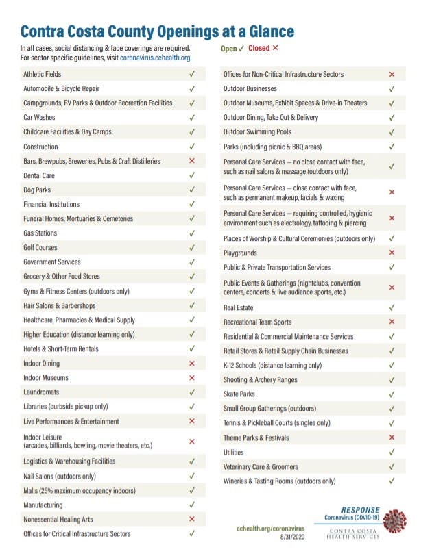 But not all businesses were given the go-ahead to reopen. Indoor dining and bars are a big loser, as they remain closed. Movie theaters, Danville's fine museums, and entertainment facilities such as the Lesher Center for the Arts in Walnut Creek are still off-limits.