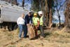 DAVIS, CA – PHOTOS: Jose Garcia (left) of the Atlas Tree and Landscape Co. hands the tree section to Robert Arndt of the Nut Tree Airport; Feral honey bee colony near the Nut Tree Airport before its removal; Garcia, project leader, Atlas Tree, Santa Rosa, prepares to save the collapsed feral honey bee colony for the Bohart Museum of Entomology; Showcasing the collapsed feral honey bee colony are (from left) Karen Cometta Shepard of Vacaville, who helped save the comb for the Bohart Museum; Arndt, Nut Tree Airport, and Garcia and Dennis Stark of Atlas Tree; Honey comb in the Eucalyptus tree measured about five feet long. This is a section; The collapsed feral honey bee colony arrives at the Bohart Museum of Entomology. It is now being prepared for display. (Photos by Kathy Keatley Garvey)