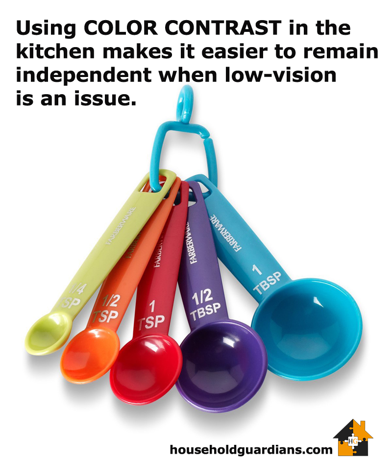 Dealing with the challenges of low-vision can be FUN. It just depends on using the right color-contrast utensils that make it easy.  You can find colorful cutting boards, knives, measuring spoons, and other utensils at local stores, like Costco, Bed, Bath & Beyond, Target, Walmart, Ace Hardware,etc.   Here’s a link to cutting boards we found on-line and for a very reasonable price.  Look around.  Making necessary changes to the home doesn’t have to cost you an arm and a leg.
