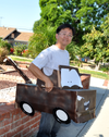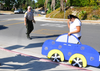 Moms and dads lined up at the curb in front of the school in decorated cardboard cars with paper plate wheels.
