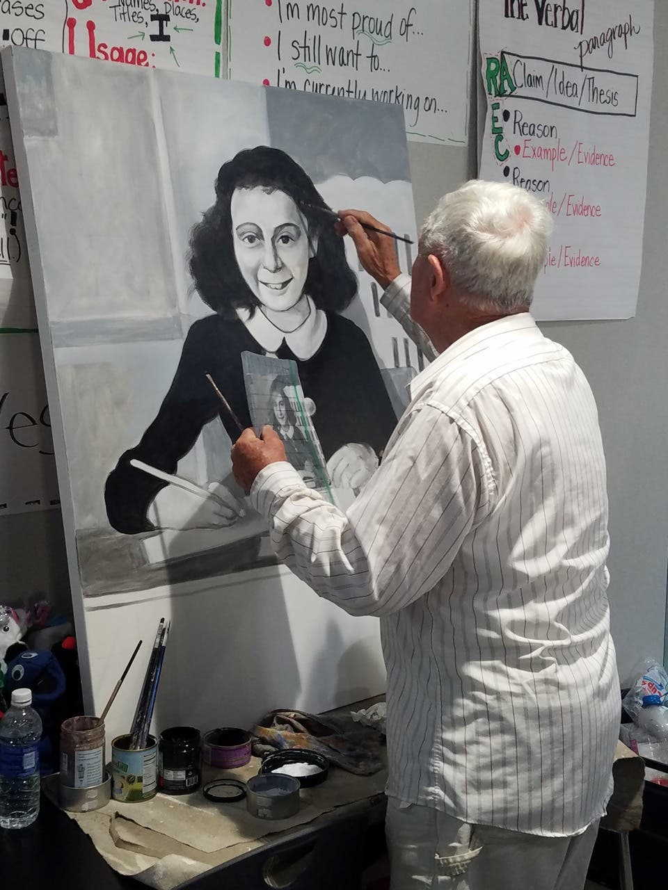 The resident artist recently completed the portrait of Anne Frank inside the classroom of humanities teacher Sherry Robertson, who describes him a “priceless member of the Cougar family.”