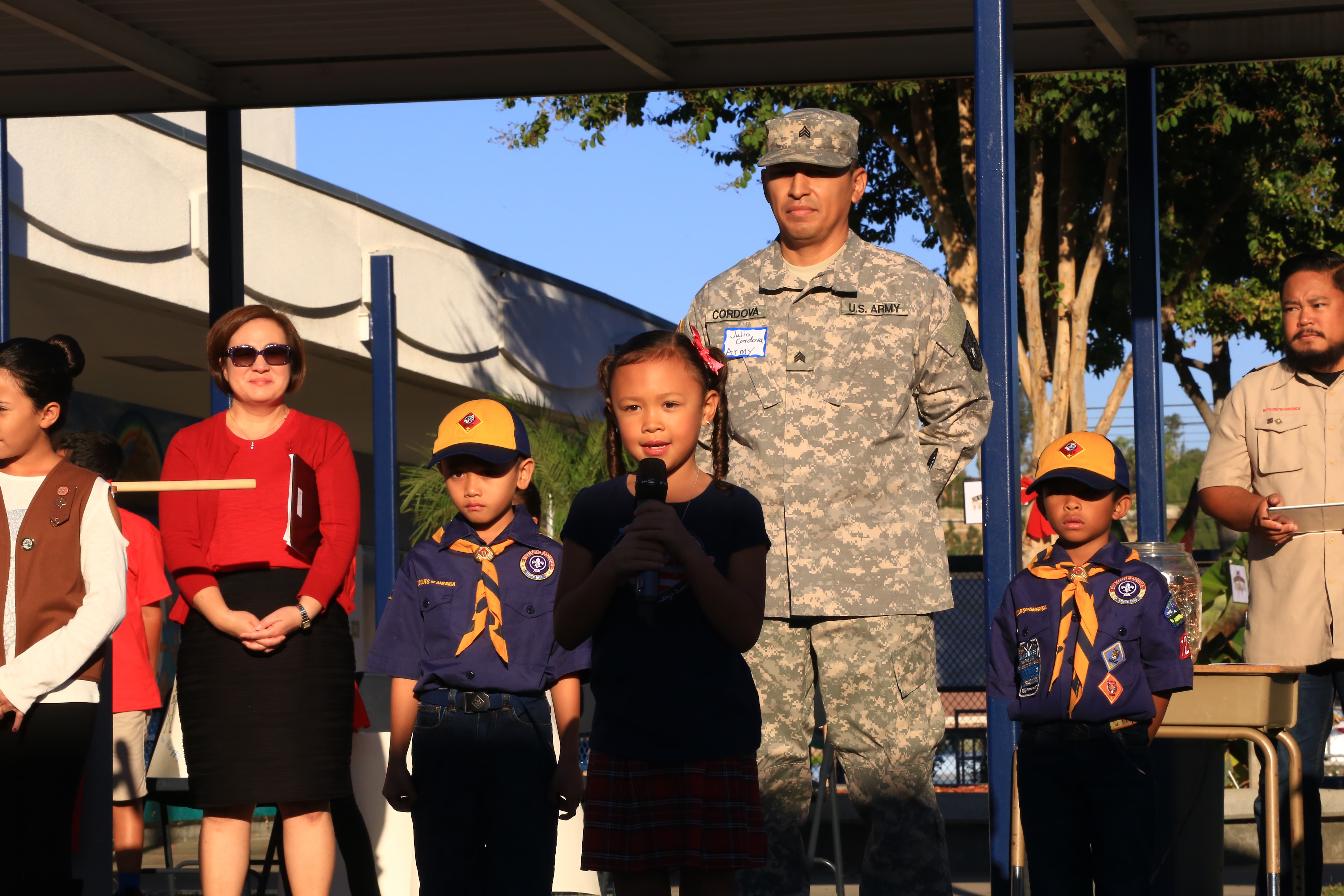 Second grader Abigail Cordova performed the national anthem as her father Julio, a member of the Army National Guard, stood behind her in uniform.