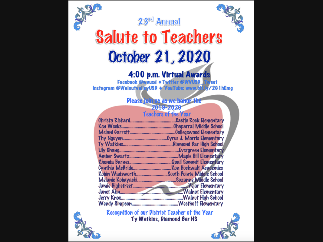 Virtual Salute To Teachers Slated For October 21 In Walnut Valley Unified School District