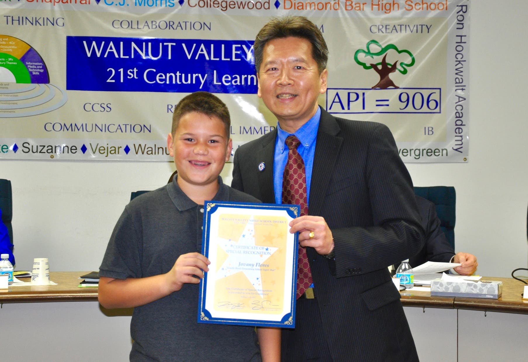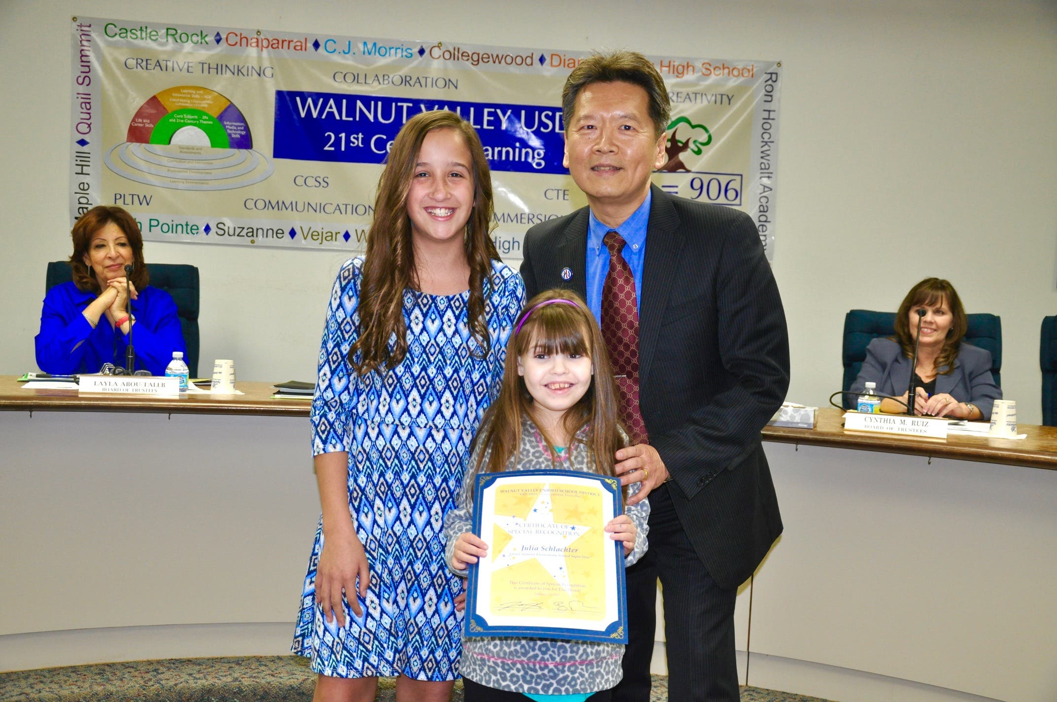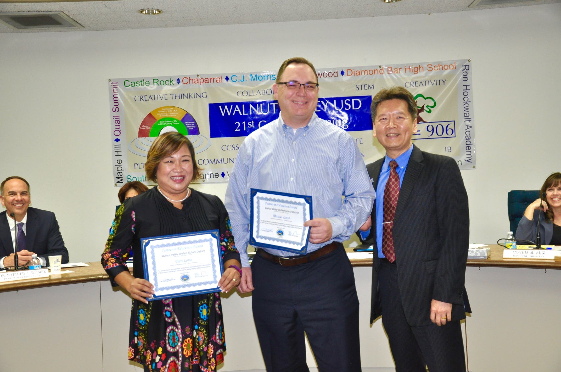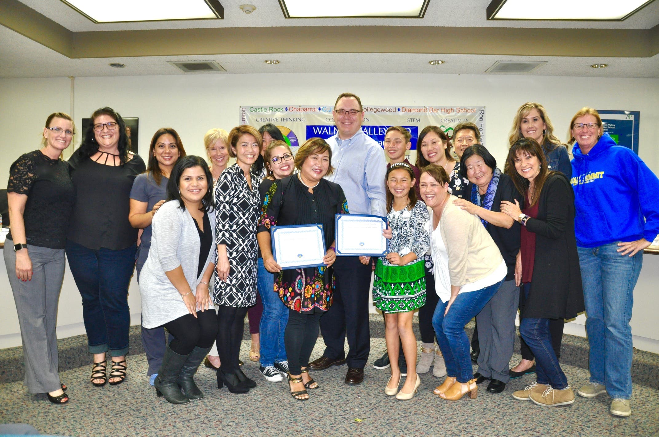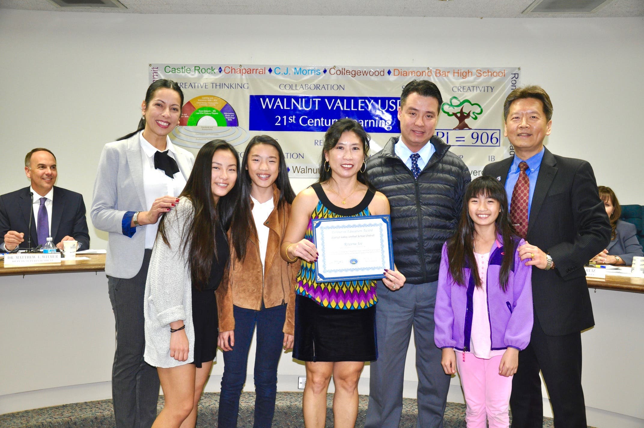 WALNUT, CA — In keeping with tradition, the Walnut Valley USD Board of Trustees honored outstanding students and parent partners during the February 15 meeting. Castle Rock Elementary parent Rowena Joe received the Partner in Education Award.