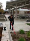 Katie Walsh, 28, a teacher with the Public Service Academy spent her Saturday morning raking mulch into place in the various planter areas on campus.