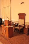 The large meeting room is curiously laid out, with a large, dignified chair and speaking podium for the Noble Grand (lodge president) in the center of one end of the room. In the center of each of the other walls is a smaller station for other officers, I assume. Lining all the walls are seats, so that attendees primarily sit on the periphery. The formal Odd Fellowsβ meetings are closed to outsiders, and there are certain symbols, passwords, and hand signals known only to members, similar to the rituals and ceremonies of the Freemasons and some other fraternal organizations.