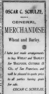 It’s too bad we can’t go back in time and view the Oscar C. Schulze store when it was in its bustling prime, to see the amazing variety of goods available in the store and its staff and customers. Perhaps we can get a hint of this by looking at the store’s ads which appear along with this column and the one photograph of its interior.