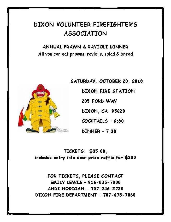 DIXON, CA β Tickets are on sale for the Dixon Volunteer Firefighters' annual Prawn and Ravioli Dinner.