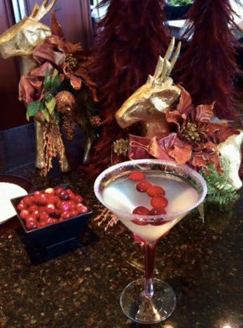 - Shake and pour into a sugar-rimmed martini glass with six cranberries in glass as garnish
