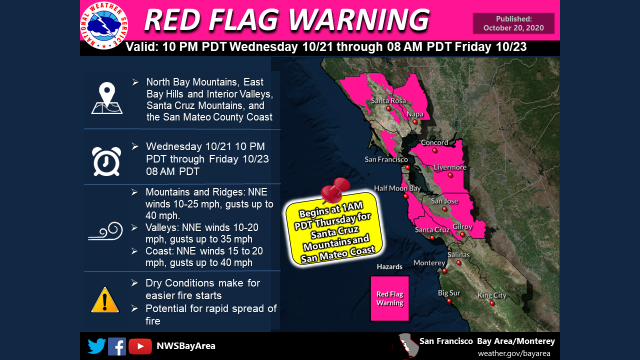 The red flag warning covers the North Bay mountains, East Bay hills and valleys, Santa Cruz Mountains and San Mateo County coastline. It's slated to begin 10 p.m. Wednesday and run through 8 a.m. Friday, though it will begin at 1 a.m. Thursday for the Santa Cruz Mountains and San Mateo coast.