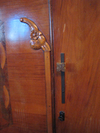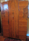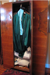 Beautiful antique carved wood and inlay armoire. Finish has seen better days, but is still beautiful. Full length mirror inside door.
