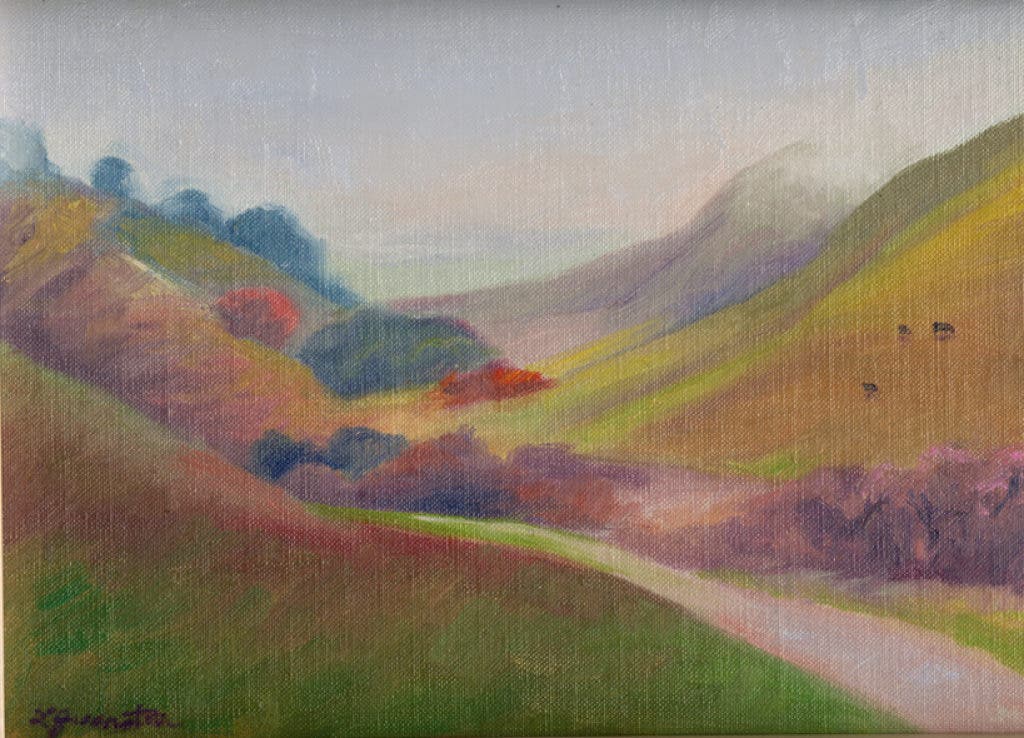 I am attracted to places where water and land interact. The California coastline and the Solano Land Trust lands are perfect for this. When I paint on location I walk around for a while searching for something that moves me to paint, like the myriad of colors in a rise of hills as they recede into the atmosphere. I’ll set up my portable easel and stand in that one place for a few hours, working quickly to paint what is before me until the sunlight changes too much to continue.