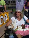Tiare Ordanza’s dachshunds, Donovan and Scarlett, outfitted as Hawaiian tourists, won in the small-dog category. Loki, owned by Beth Bittle, prevailed in the medium-dog category as a punk rocker with a striking purple Mohawk. And Suzie Rudloff’s dog, Otis, was named the winner in the large-dog category for his bucking-bull costume complete with rider.