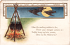 The other card has a message: "Hear the seething cauldron's din; Throw your strongest potions in --- Swiftly bring my love, unseen, Unto me this Hallowe'en!" A brew of some kind of love spell boils in the cauldron over a blazing fire, and three ravens fly across a full moon. Little grinning pumpkin faces parade across the top. "Mrs K" of Vallejo sent it to Mr. D. Tunney of San Rafael on October 30th 1917.