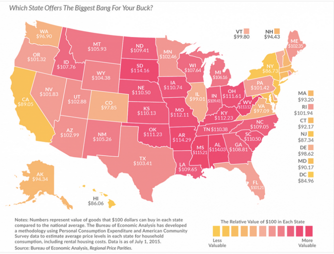 In other words, how much worth of goods can $100 buy in your state vs. those same goods around the country?