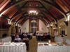 One of the club’s most distinctive elements is the magnificent main hall, designed by architect Walter Ratliff. On the outside, it looks a bit like an English Tudor manor, and on the inside, it resembles something of a blend of a church sanctuary, baron’s ballroom and Nordic mountain lodge — with its lofty peaked ceiling supported by large arched wood beams, its sparkling chandeliers, its commanding fireplace and its floor-to-ceiling windows at the head of the room overlooking the Bay and containing images highlighted with tinted glass.