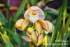 I have a photo of another cymbidium orchid to add to last week’s bouquet. One barely-open Sussex Dawn Concolor peeks above multiple closed buds on the same stalk.