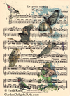I found some pages from an old ripped-up French/English piano music book for children. Leafing through it, this page for "Le petit oiseau / The Warbler" jumped out at me. I chose several of my bird photographs and arranged them on a blank canvas in Photoshop Elements the same size as the sheet music, which I cut down slightly so it would fit in my printer. It went through with no problem. Printing on untreated paper doesn't look the same as on paper that's treated for inkjet inks, so the colors are a bit muted and the resolution isn't as sharp, but I like the effect on the aged paper and with the musical notes running through the images.