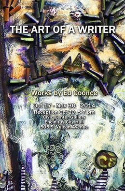 On Monday 10/20 from 5-7 PM come join Ed Coonce in celebrating his new exhibition, The Art of a Writer, at Encintas City Hall. There will be refreshments and live music by Dillon Casey and Tim McNalley of Second Cousins. The exhibit will be up at City Gall from 10/16-12/1.