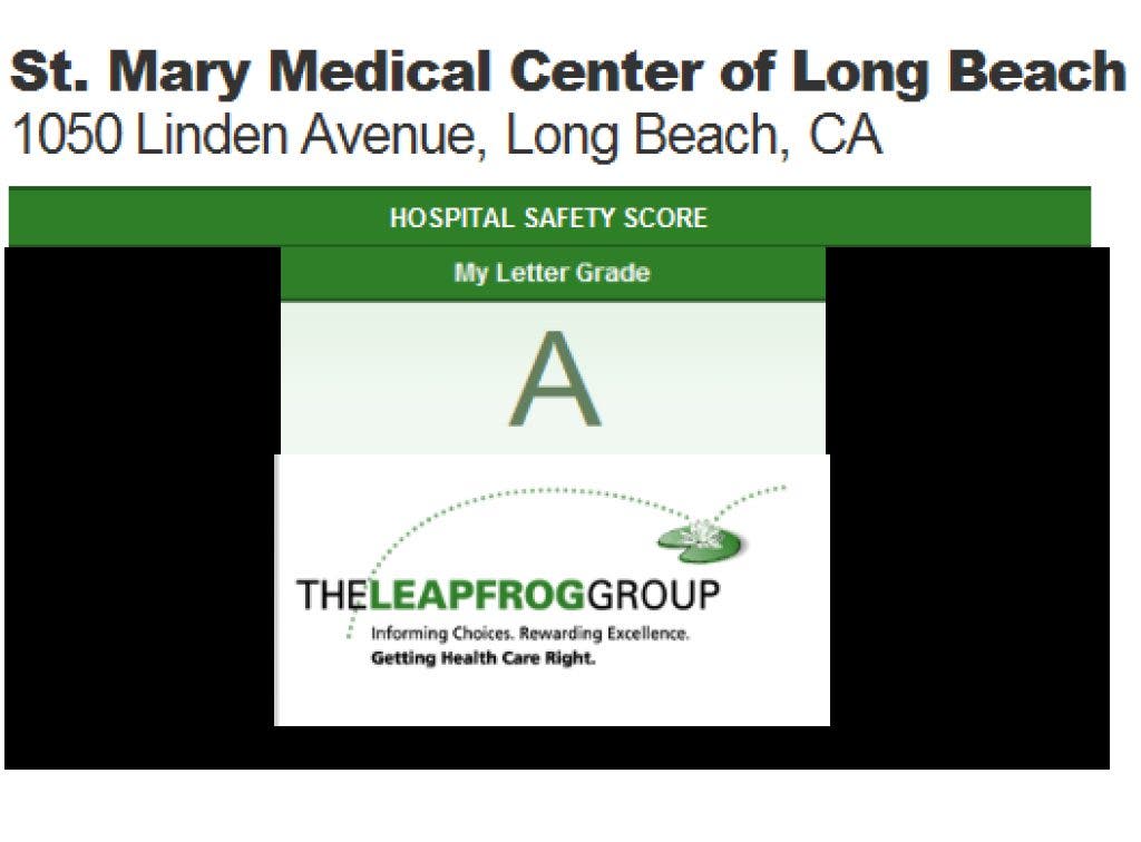 Long Beach, CA -- St. Mary Medical Center has been awarded an “A” for patient safety as reported recently by The Leapfrog Group, an independent national nonprofit run by employers and other large purchasers of health benefits. The Group uses 26 measures of publicly available hospital safety data to produce a single score of A, B, C, D or F, which represents a hospital’s overall capacity to keep patients safe from infections, injuries, and medical and medication error.