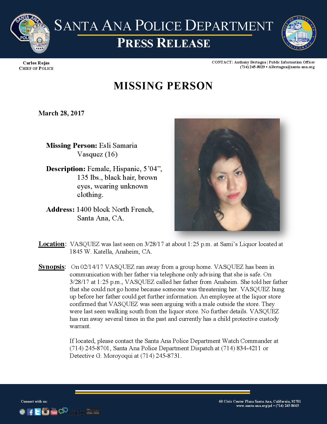 Esli Samaria Vasquez ran away from a group home on Feb. 14, according to Santa Ana police Cpl. Anthony Bertagna.