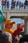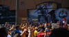 The crowd cheered as the celebration continued. Shouts and applause followed as a closing explosion of blue and red streamers shot into the sky.