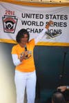 Claudine St. Pierre introduced the boys and praised their achievements. Then she held up the "lucky shoes" which accompanied the team to South Williamsport, Pennsylvania.