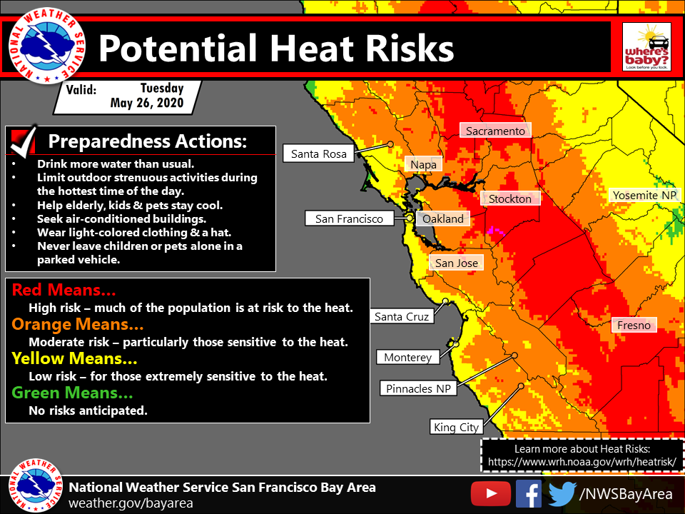 EAST BAY — A Heat Advisory is in effect for the region with temperatures expected to peak on Tuesday and Wednesday, according to the National Weather Service. Here in the East Bay, temperatures over 90 will be common, with a few 100's expected.