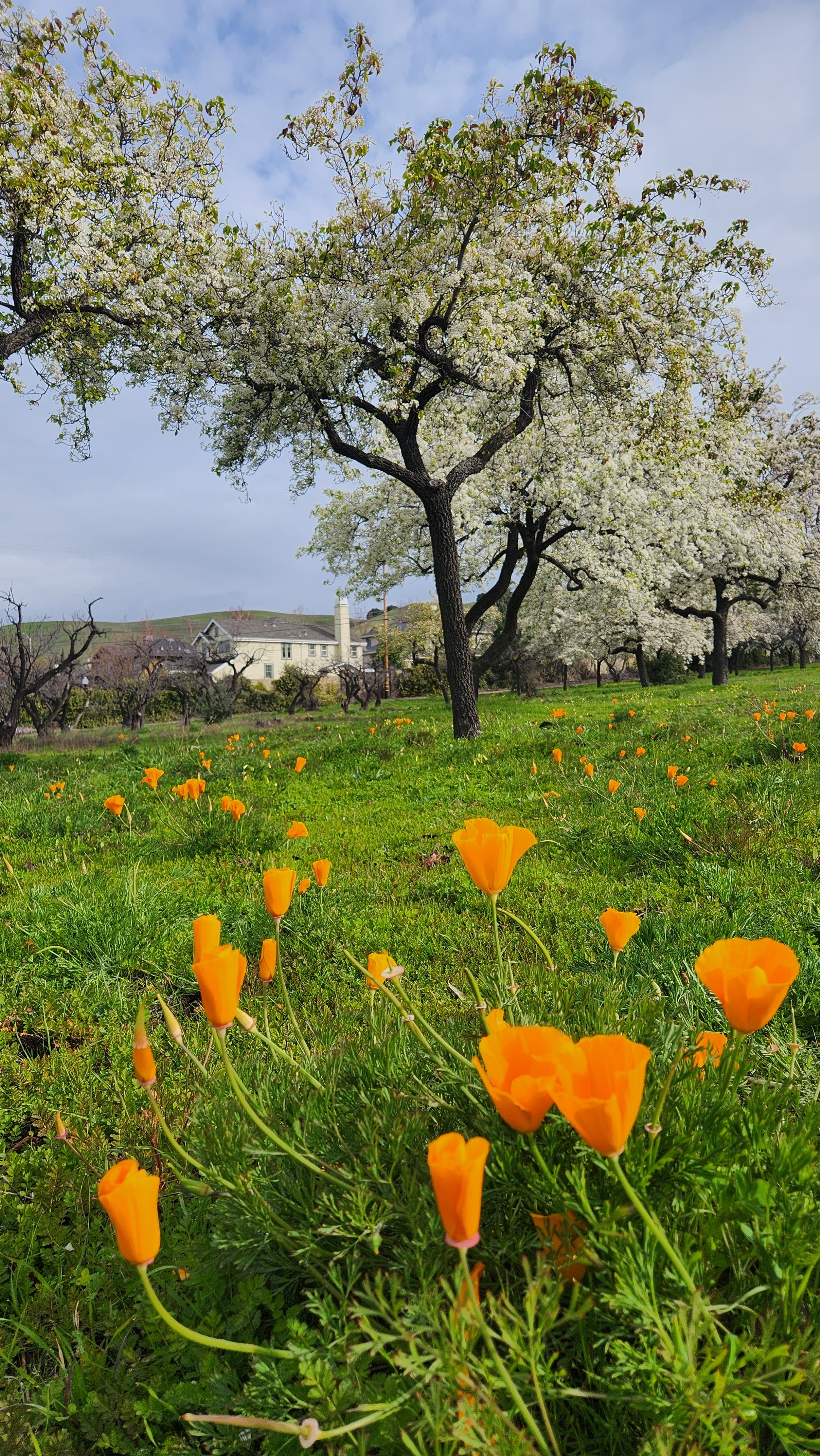 Bradford pear tree with California poppy blooming in the foreground. Photo by Henry Shen.