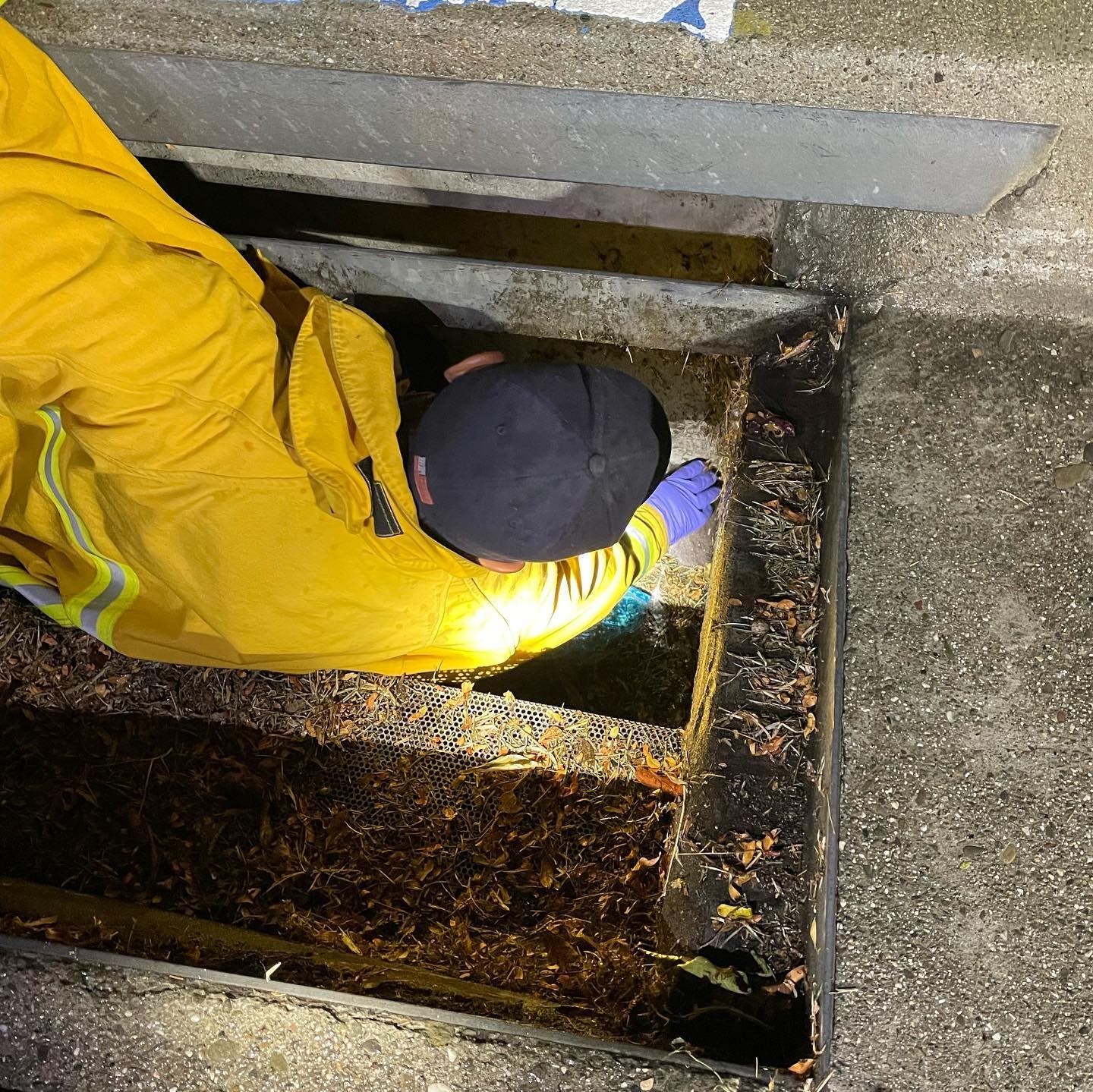 Firefighter Tony Trujillo, Engineer Allan Diaz, and Captain Osh Ahmad removed the heavy grate covering the deep drain.