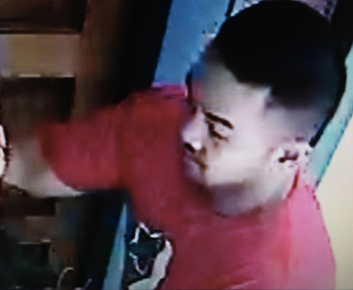 The suspect is described as a Hispanic or Filipino male adult in his early to mid 20’s with a light to medium complexion. He is between 5’06” and 5’09” tall and has a medium athletic build (between 165 and 175 pounds). He has short dark colored hair and a dark colored mustache. He was wearing a red colored short sleeve shirt and black shorts.