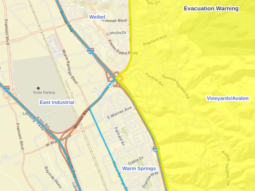 The Tesla assembly plant, Fremont's largest employer, is not in the warning zone.