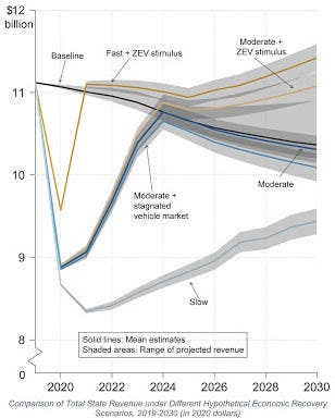 The study finds that state policy choices could counteract projected revenues shortfalls. King explains that “one hypothetical recovery scenario we tested could generate $121 billion, a 3% revenue gain compared to revenue had COVID-19 not struck.” This scenario assumed a swift and complete economic recovery coupled with policies to encourage Californians to purchase electric vehicles.