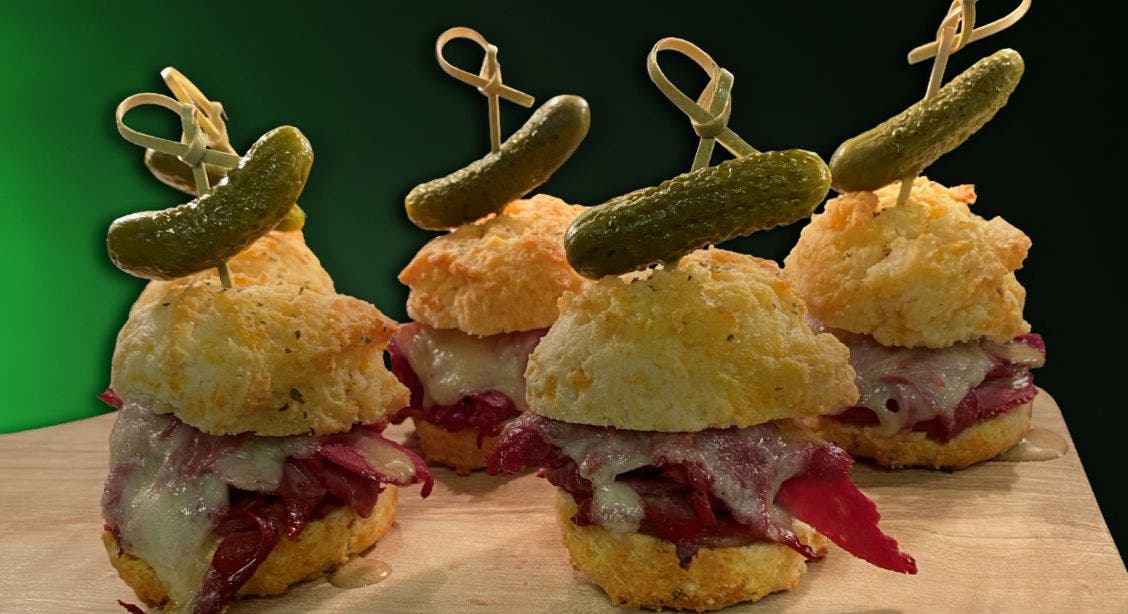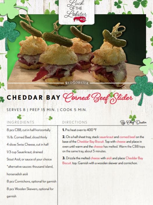 The "Cheddar Bay Biscuit Corned Beef Slider" transforms traditional corned beef into a possible, new tradition using hot Cheddar Bay Biscuits To-Go from Red Lobster as the slider buns.